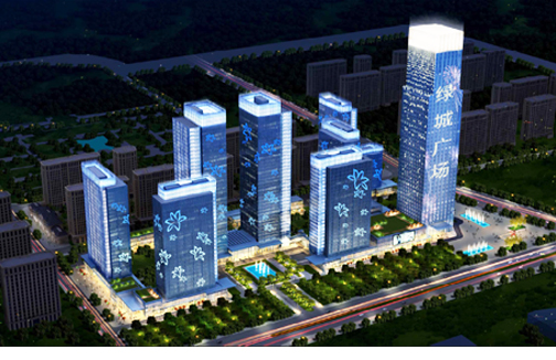 新疆綠城廣場    夜景突顯建筑天際,同時結合地域文化以雪蓮花為主要立面造型表現,主塔樓采用瀑布理念進行點綴,繪制優美的西域篇章。