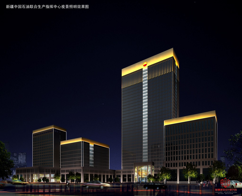 新疆中石油生產指揮中心 中國石油駐新疆烏魯木齊聯合生產指揮中心位于烏魯木齊高新區衛星廣場,是烏魯木齊市北京路沿線第一高樓,新市區的新地標。高效節能的投光燈和 LED線條燈顯示出莊重大氣的建筑外觀。